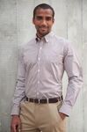 60% Cotton, 40% Polyester, peach finish. Tailored fit, button down collar, bias cut detailing, chest pocket, contrast thread detail